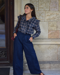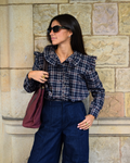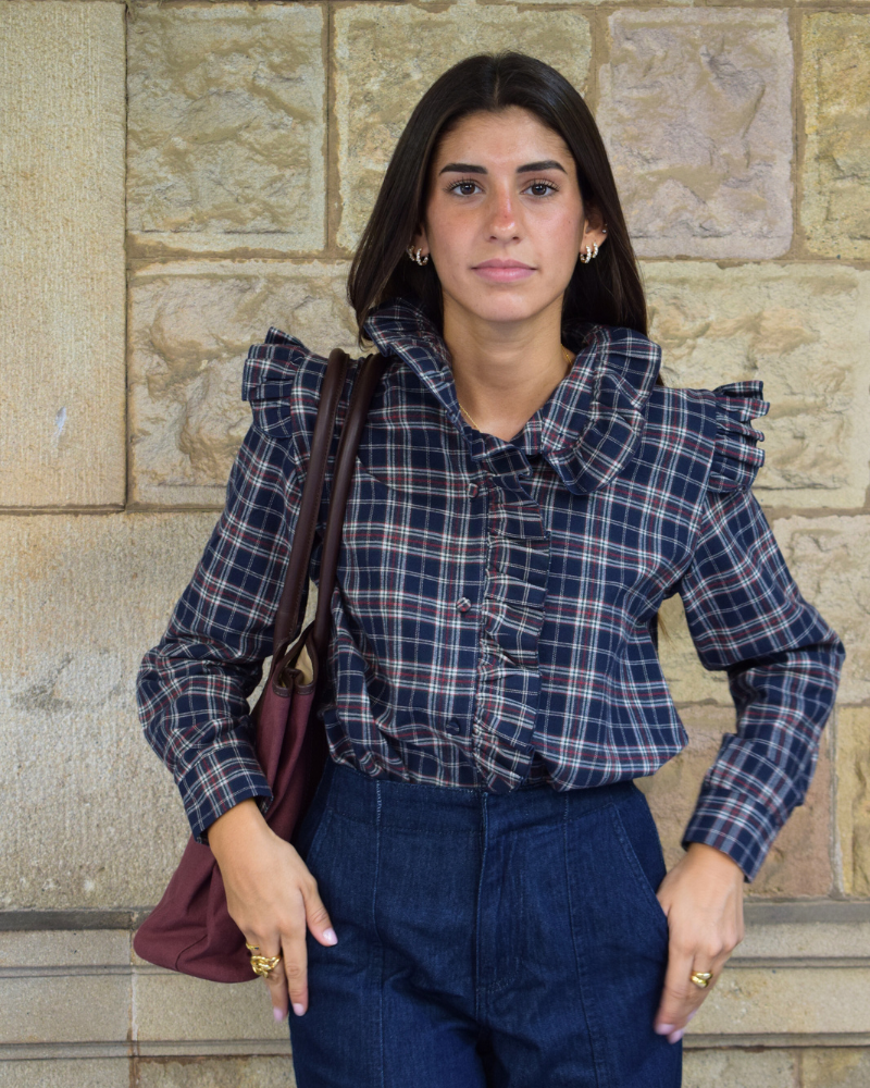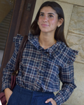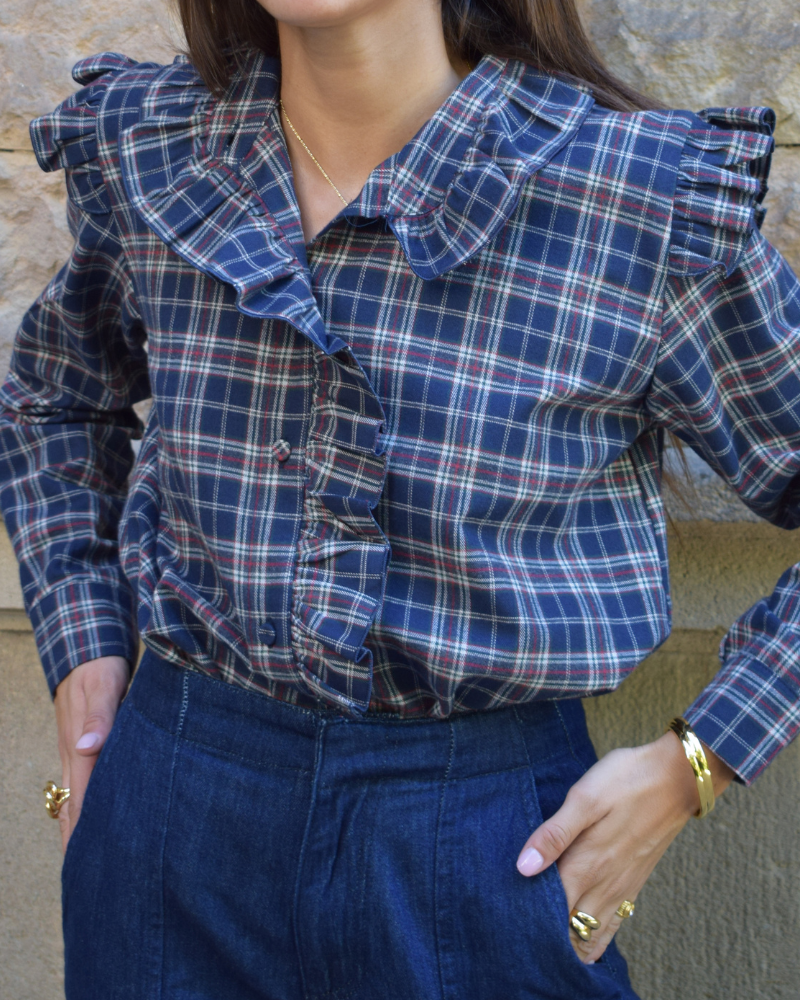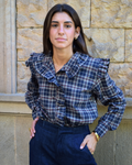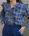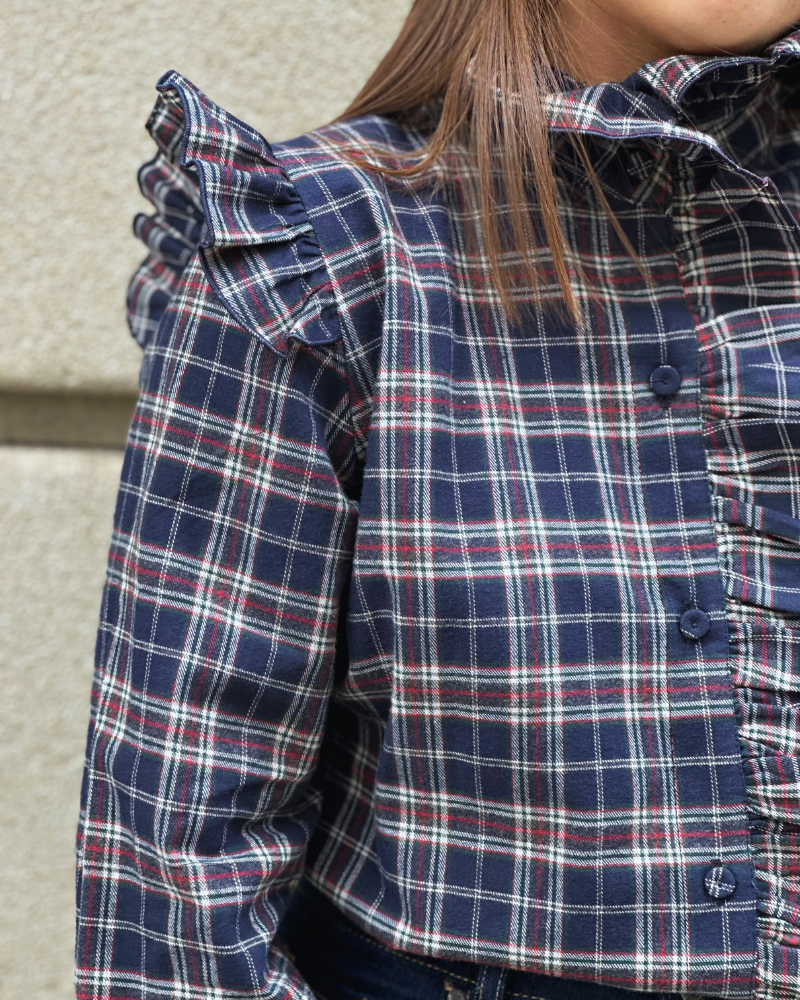 Camisa de tejido de algodón orgánico en cuadro tartán azul, beige y granate. Cuello con volante que baja por todos los botones. Manga larga con volante en el hombro y acabado con puño que ata con botón.