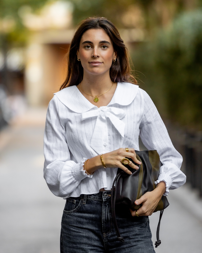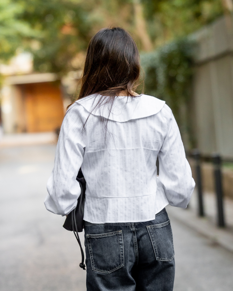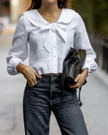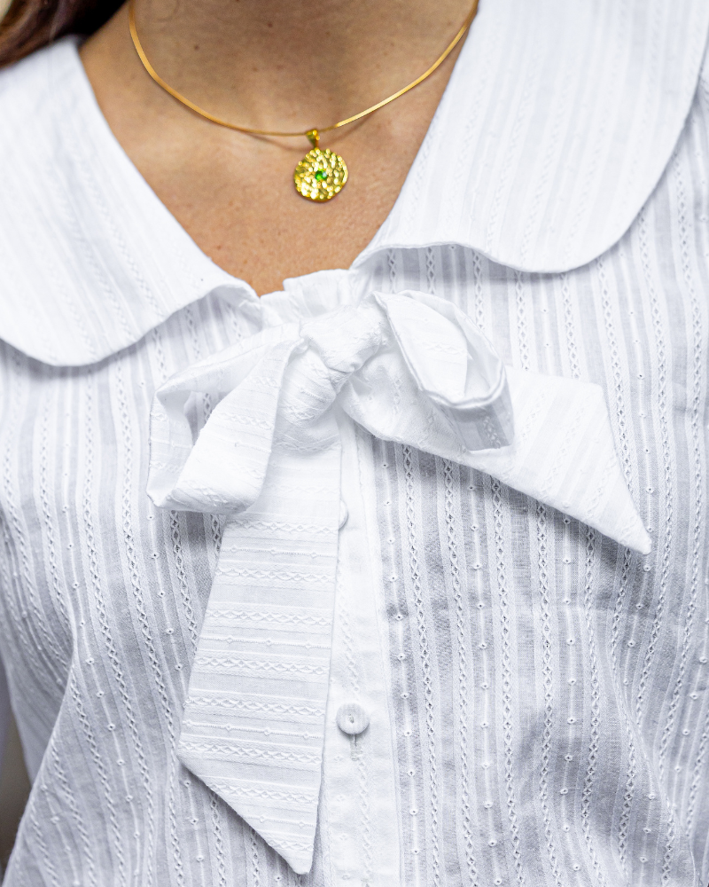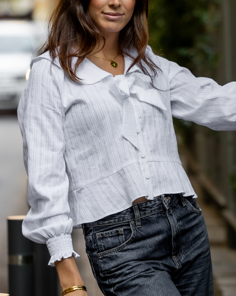 Camisa de tejido blanco con un delicado bordado de trencitas que aporta una textura sutil. Presenta un cuello camisero redondo estilo baby doll con un lazo central. Abotonada de arriba abajo. Manga larga un poco abullonada acabada en puño con frunce y volante.