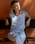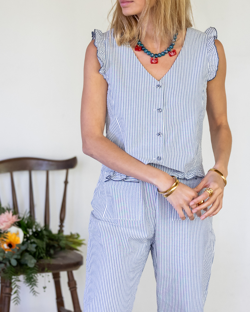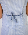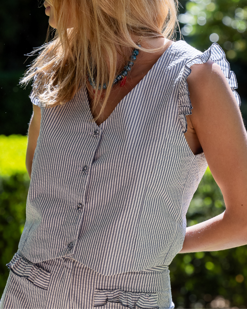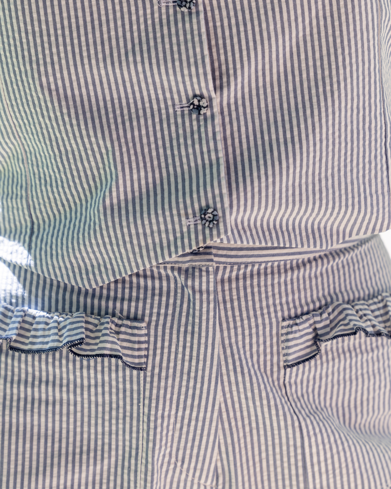 Chaleco de tejido seersucker rayado azul y blanco. Volante en las mangas con ribete azul marino. Abotonado de arriba a abajo con botones forrados de flores. Cuenta con un lazo en la parte de atrás de estampado de flores para que se ajuste perfectamente a tu figura.