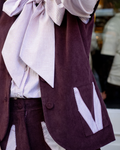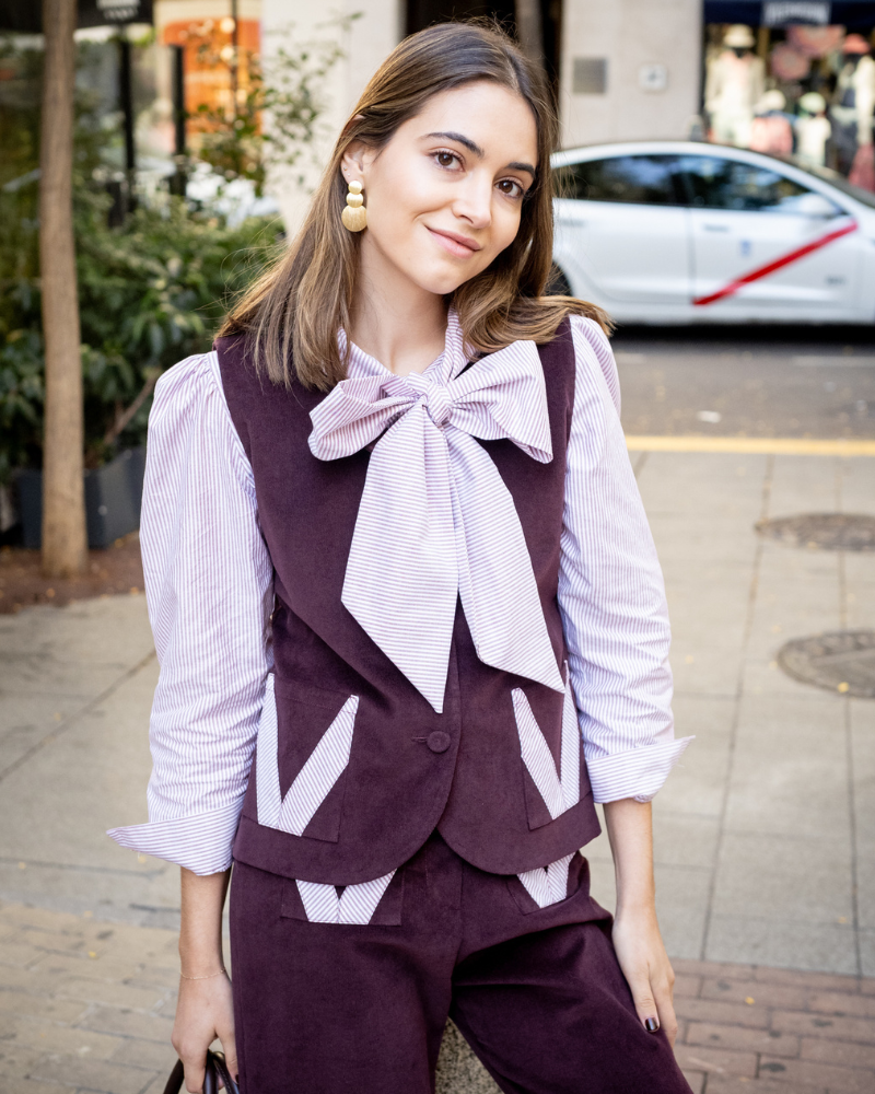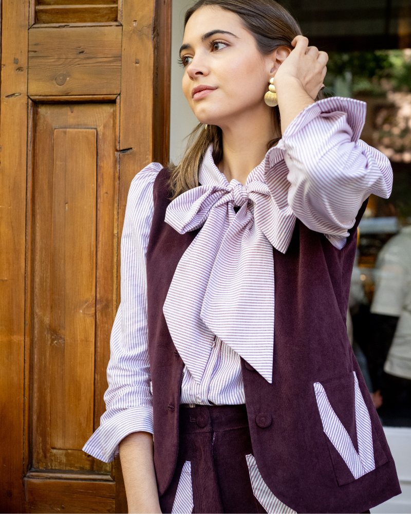 Chaleco de pana granate. Con cuello redondo, botones forrados al frente y dos bolsillos con detalles de rayas granate claro y blanco.