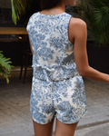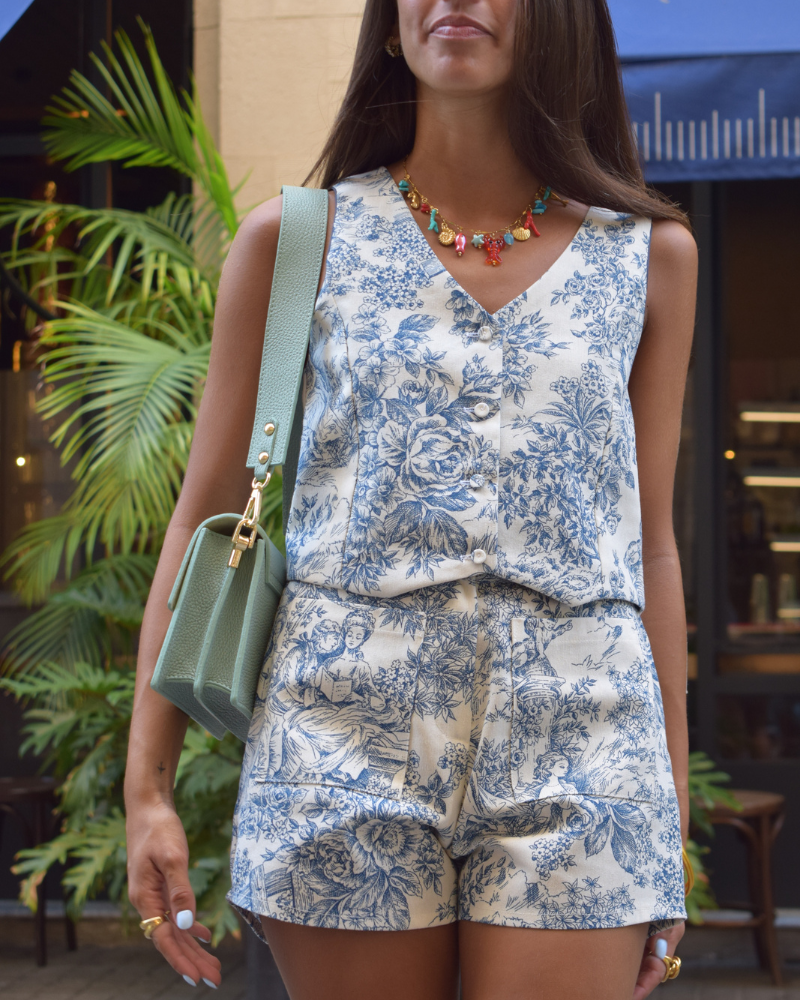 Chaleco corto de tejido estampado Toile de Jouy Azul. Escote pico. Forrado en tejido azul brillante. Abotonado de arriba a abajo con botones forrados en el mismo tejido. Cuenta con un lazo en la parte de atrás que permite ajustarlo a tu figura. Combínalo con el pantalón o la bermuda a conjunto, o con cualquier pantalón blanco o tejano.