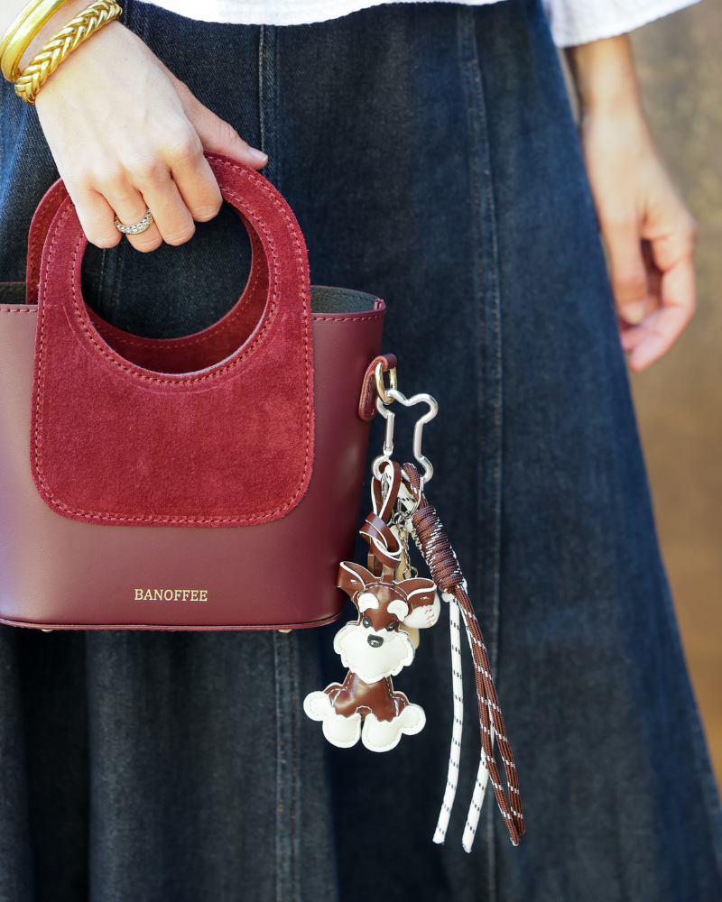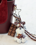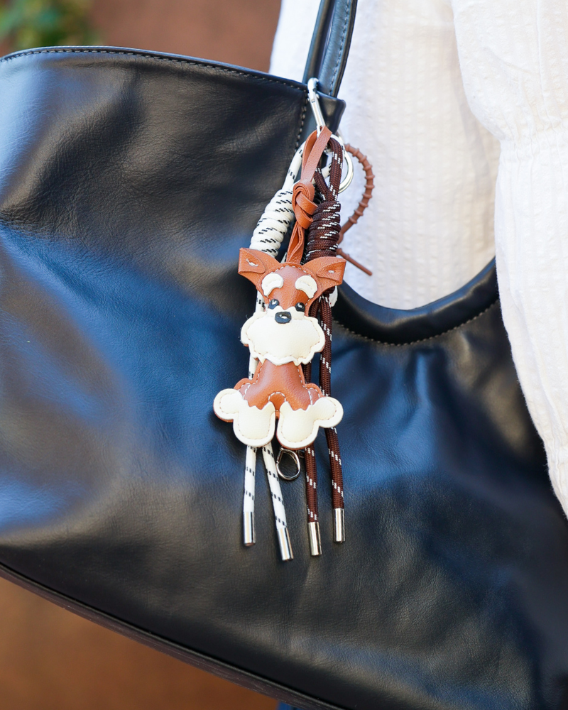 Llavero charm para bolso con perrito schnauzer en polipiel y varios colgantes.