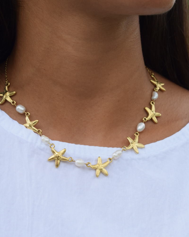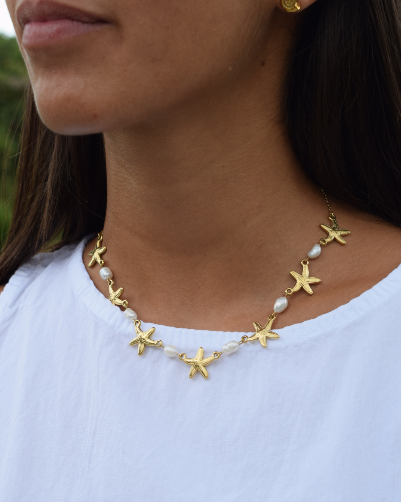 Collar con 7 charms de estrella de mar y 5 de perla.