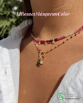 Collar superior: gargantilla de piedra mineral Rubí rondelle con 3 lágrimas circonitas. Medida: 36cm + 10cm de alargo.