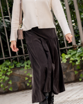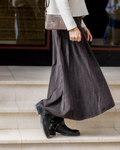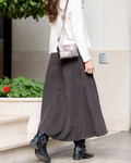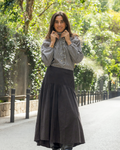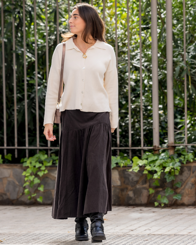 Falda con mucho vuelo de tejido de pana marrón. Presenta un canesú en la cadera, que aporta estructura y realce a la silueta, garantizando un ajuste favorecedor. Cintura de goma ajustable.