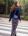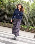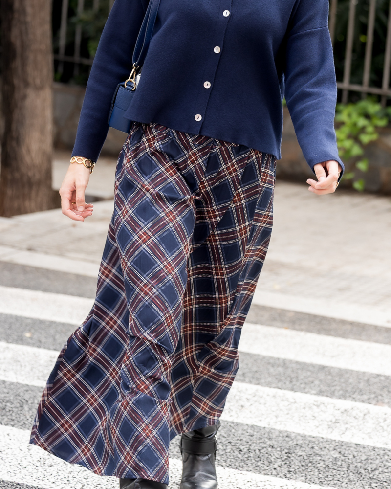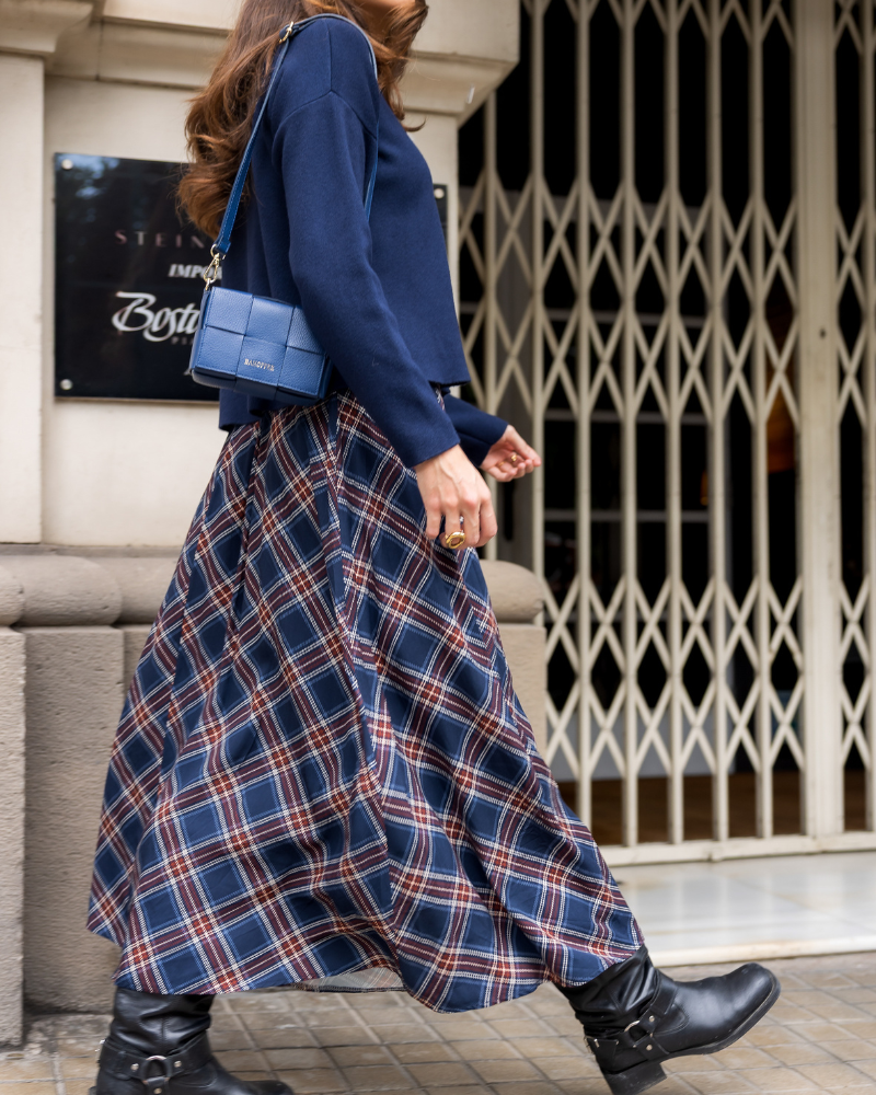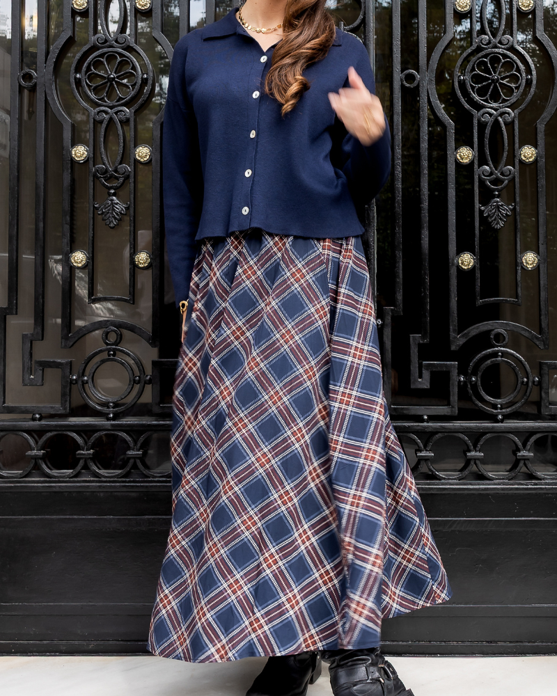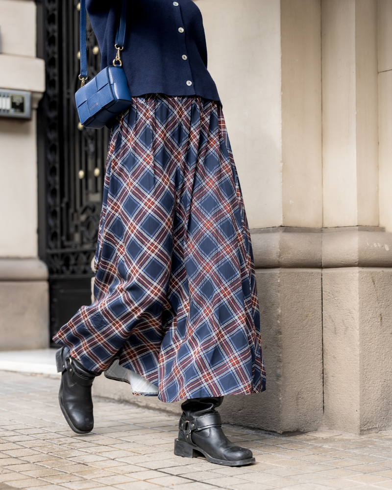 Falda midi de estampado escocés en color azul marino y granate. Cinturilla con goma que permite que se ajuste perfectamente a tu figura. Falda con vuelo.