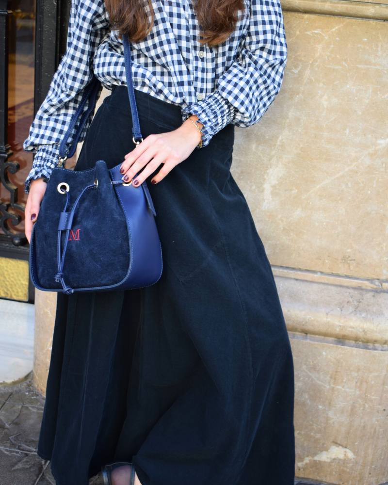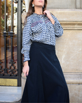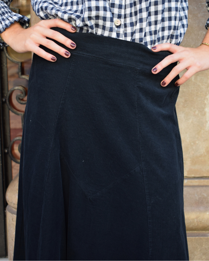 Falda con mucho vuelo de tejido de pana azul marino. Cintura de goma ajustable.