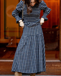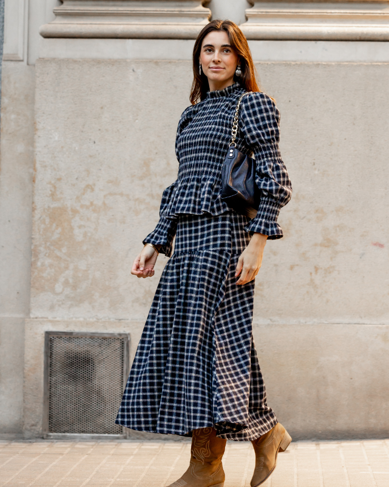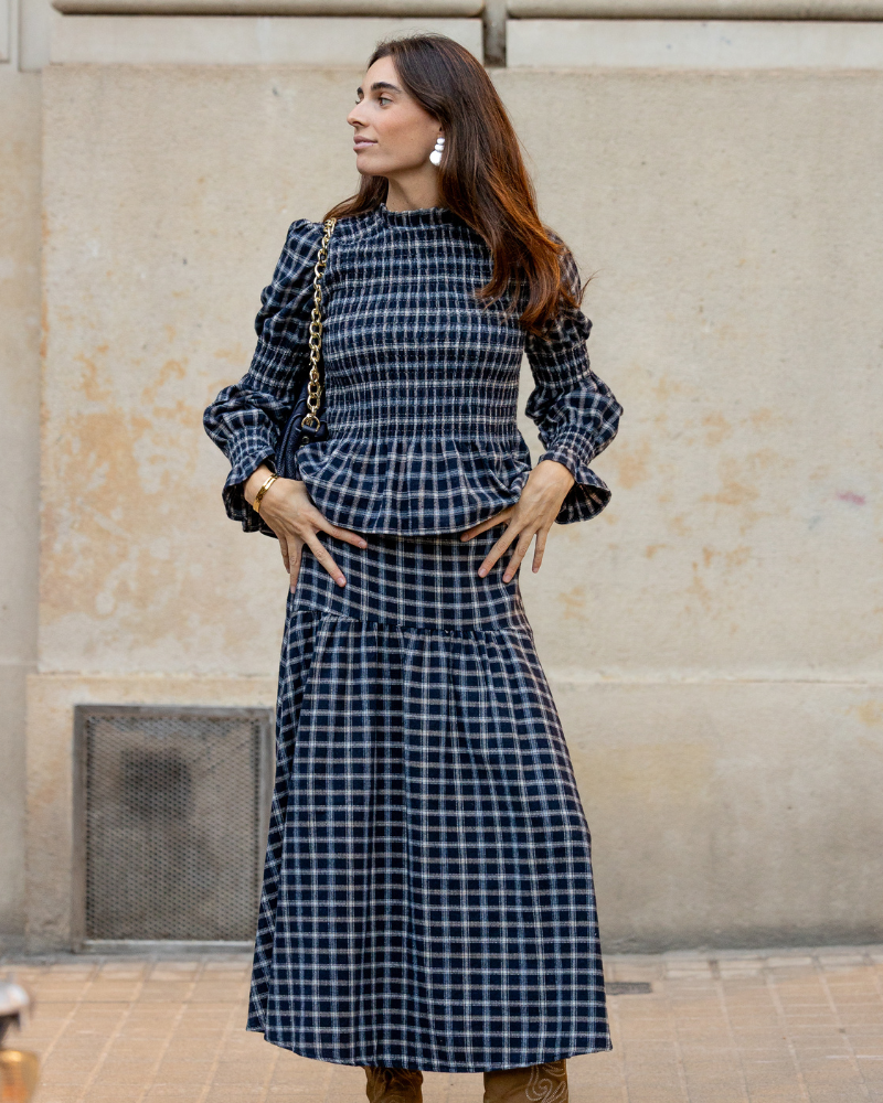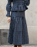 Falda larga con mucho vuelo de tejido tipo lana en cuadros azul marino. Presenta un canesú asimétrico en la cadera, que aporta estructura y realce a la silueta, garantizando un ajuste favorecedor. Lleva goma en la parte trasera para un mejor ajuste.