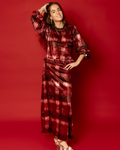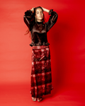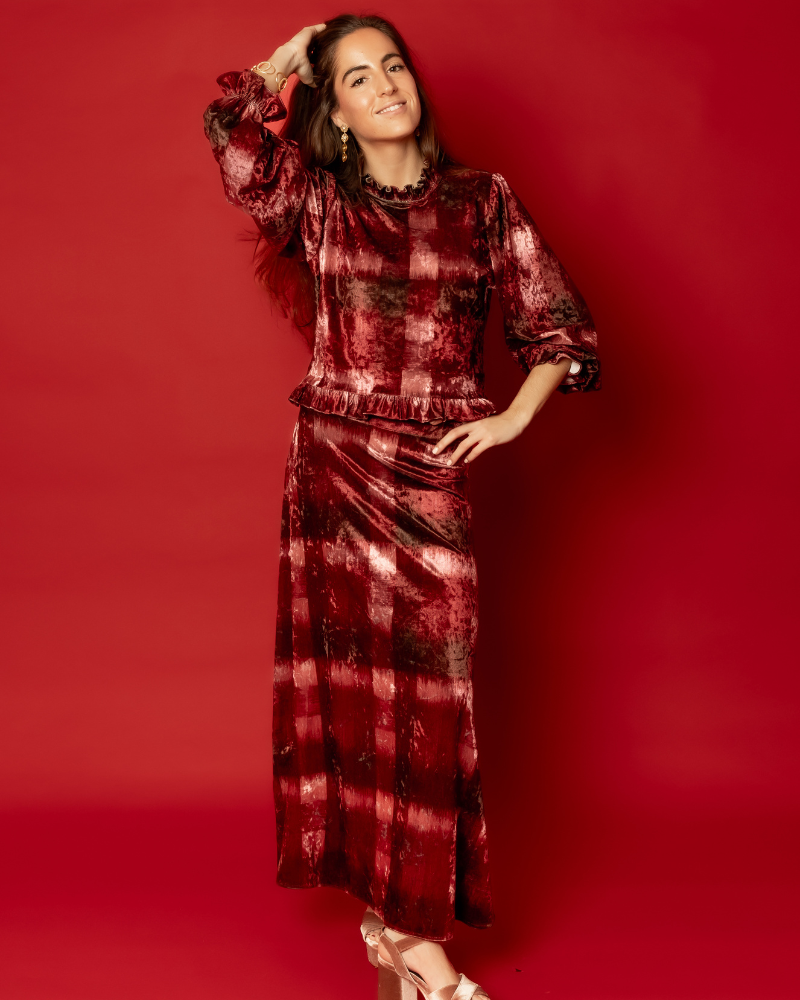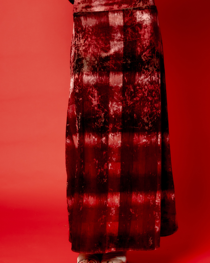 Falda midi de tejido de terciopelo con estampado degradado en tonos burdeos, vino y marrón. Cinturilla gruesa con goma. Falda con vuelo.