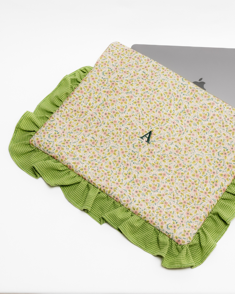 Funda personalizada con tejido liso de florecitas en tonos rositas y verdes. Con volante alrededor de mini vichy en tonos verdes.