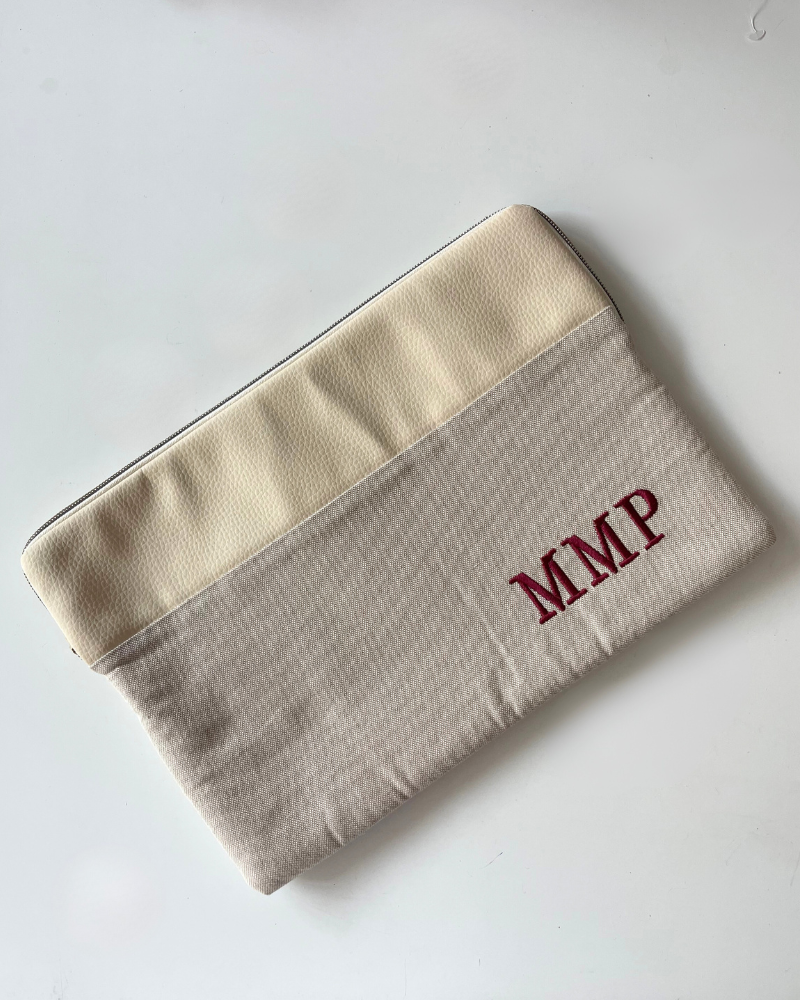 Funda personalizada de tela de saco beige y polipiel beige claro. Forrada por dentro con tejido crudo. Cremallera dorada con tirador.