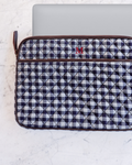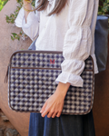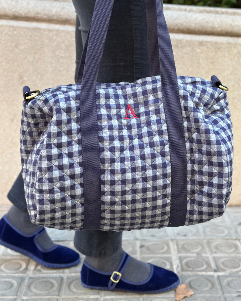 Funda personalizada de tela de vichy acolchada lona en color granate con detalles en piel marrón chocolate. Cuenta con un bolsillo exterior. Forrada por dentro con tejido crudo. Cremallera dorada con tirador.