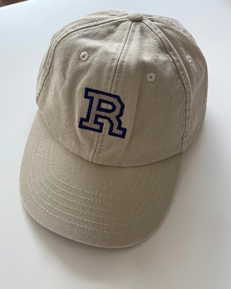 Gorra con visera en color beige bordado R en beige y azul marino.