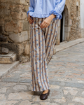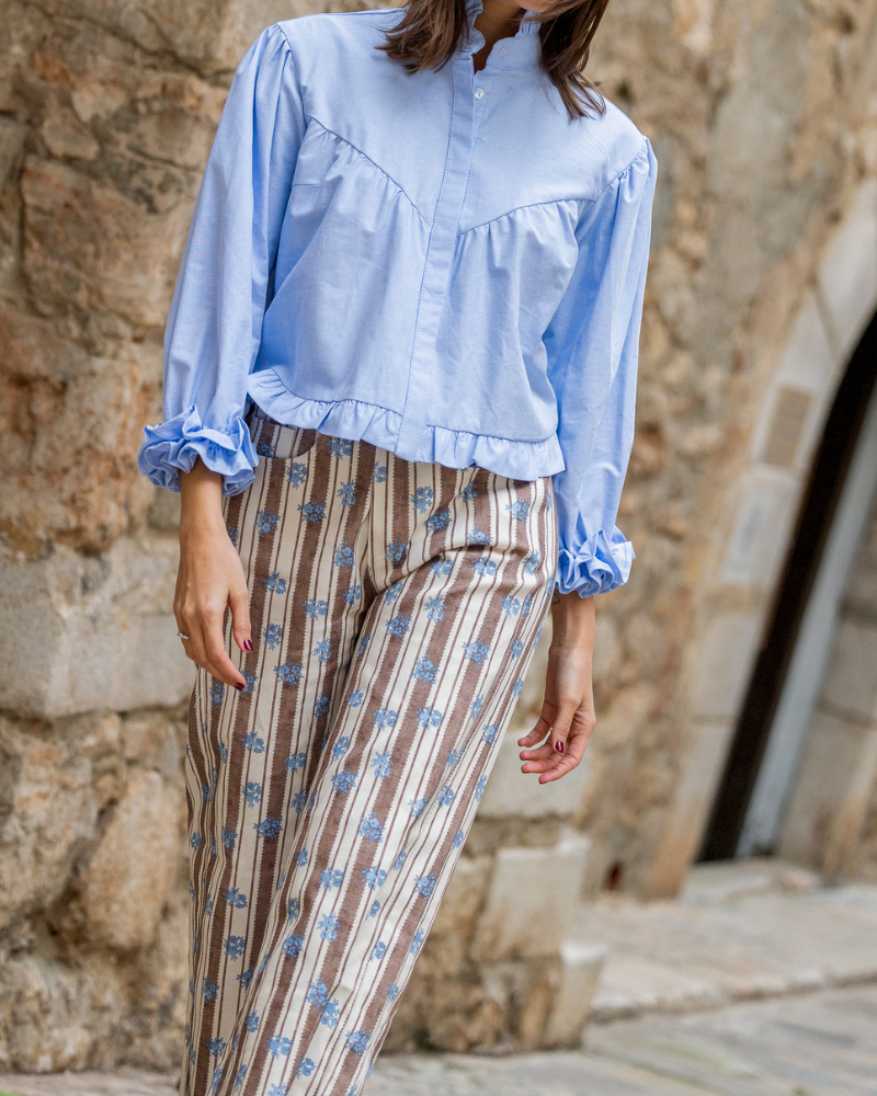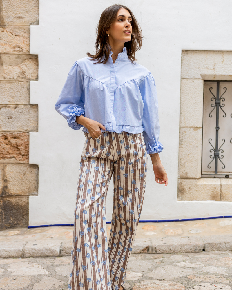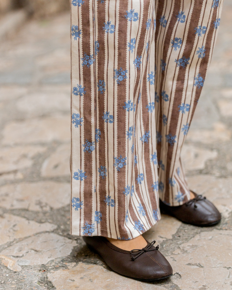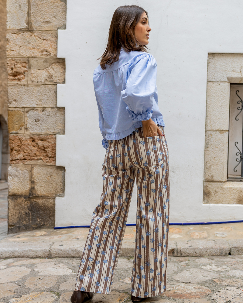 - Pantalón de rayas marrones y flores azules