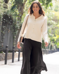 Jersey de punto suave color beige. Abotonado de arriba a abajo por la pantera delantera y con cuello camisero.