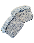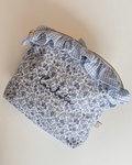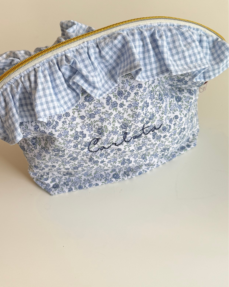 Neceser de tela de algodón con estampado de flores azules con volante de mini vichy azul. Ambos tejidos de algodón orgánico. Cremallera metálica dorada.
