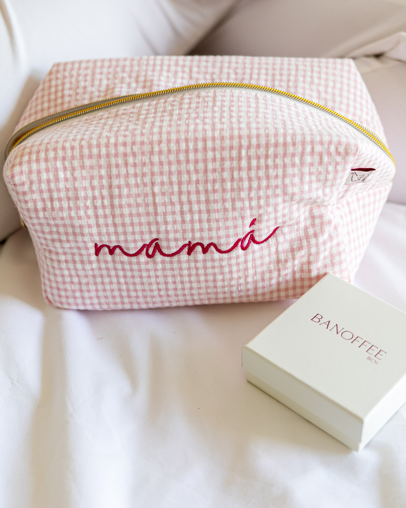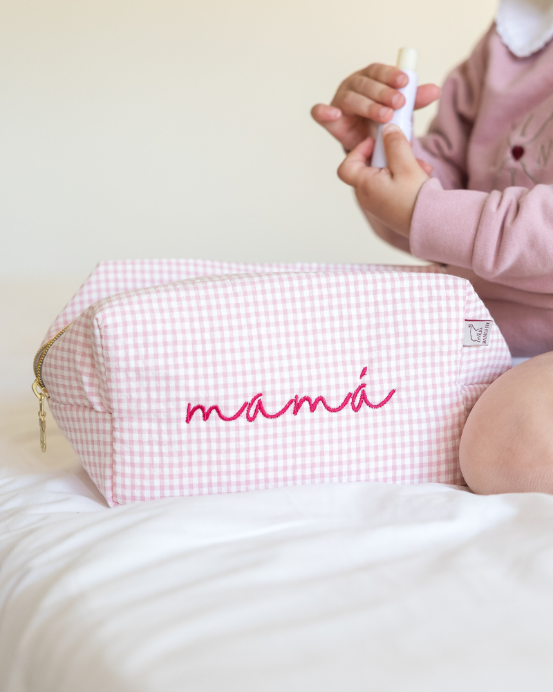 Neceser de tela de cuadro pequeño rosa con forro interior en color beige. Va reforzado por lo que tiene forma. Cremallera dorada en color crudo con tirador.
