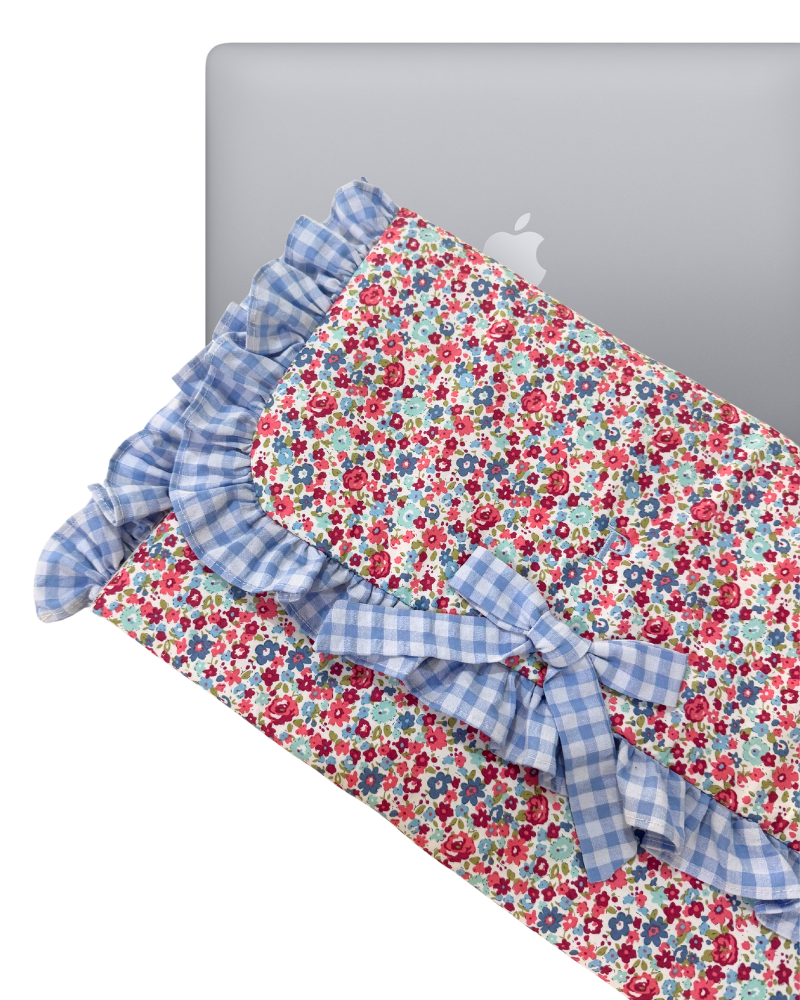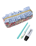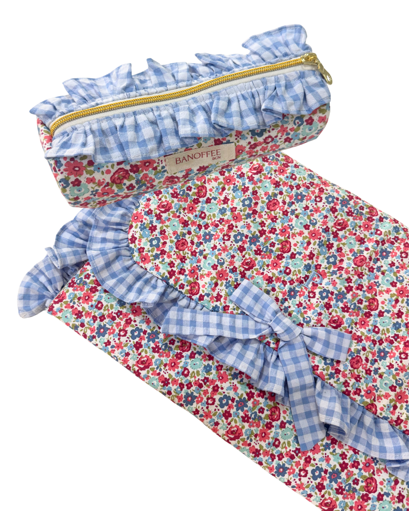 Estuche con tejido de flores. A los lados de la cremallera tiene volante con estampado de vichy azul.
