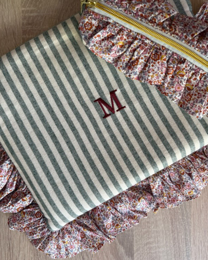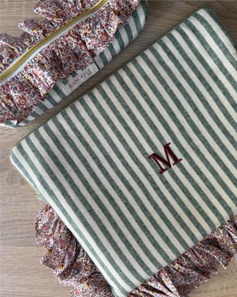 Estuche con tejido de lona de rayas verdes. Tiene un volante de tejido de flores en la parte superior.