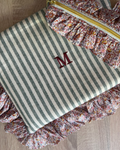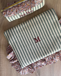 Funda personalizada de tejido de rayas finas verde. Rodeada con un volante en florecitas en todo su alrededor.
