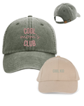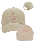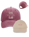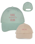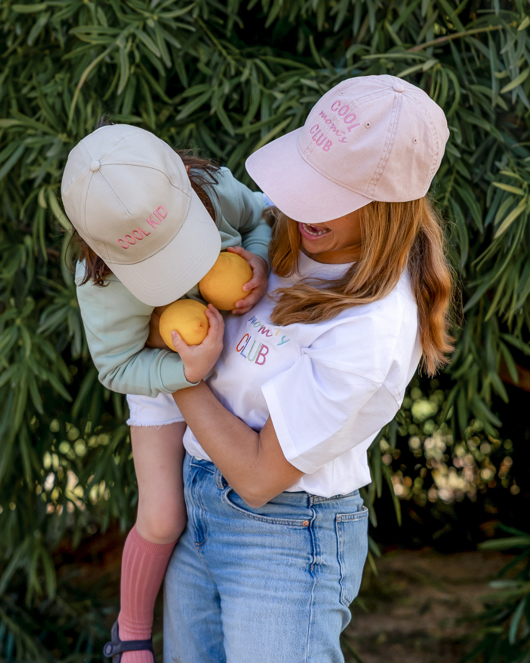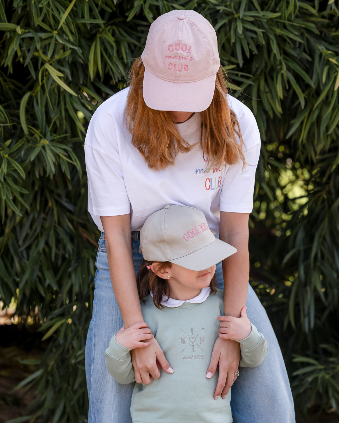 - Gorra con visera ajustable personalizada con las palabras Cool Mom's Club o COOL KID y una frase debajo.