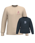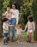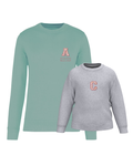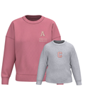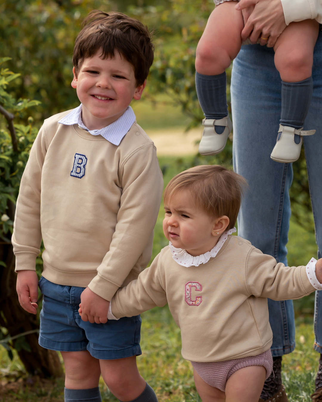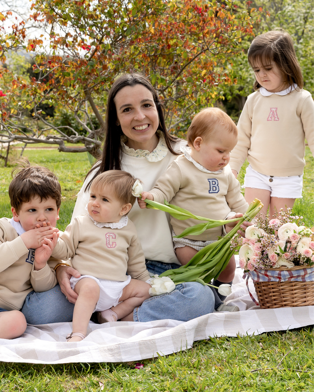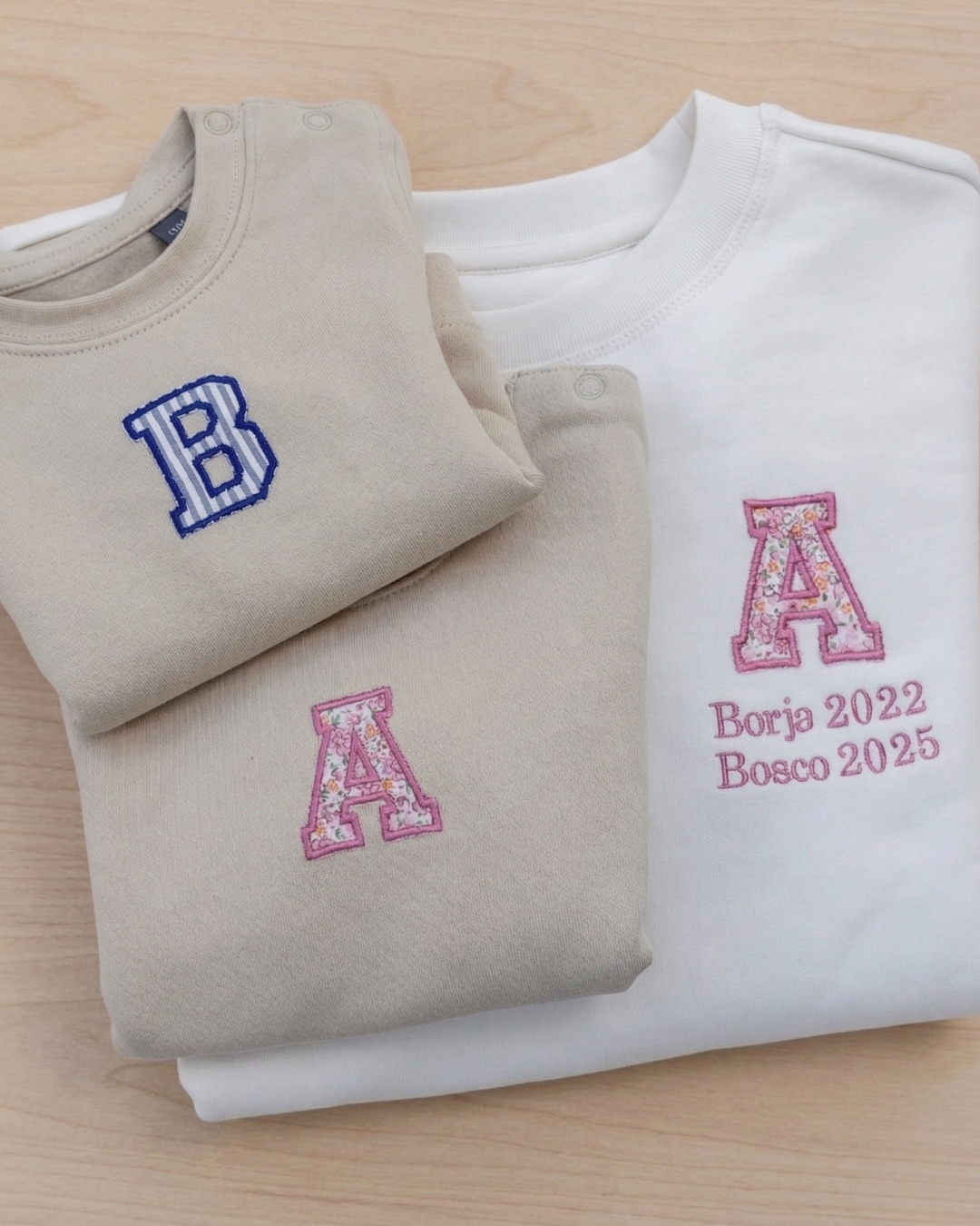 En cada sudadera se borda una inicial con estampado de flores fucsia o rayas azules, y en la de la madre una palabra o frase.