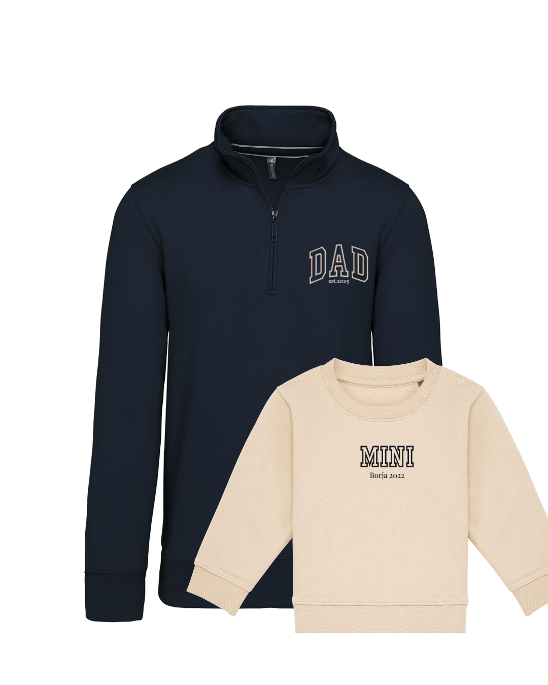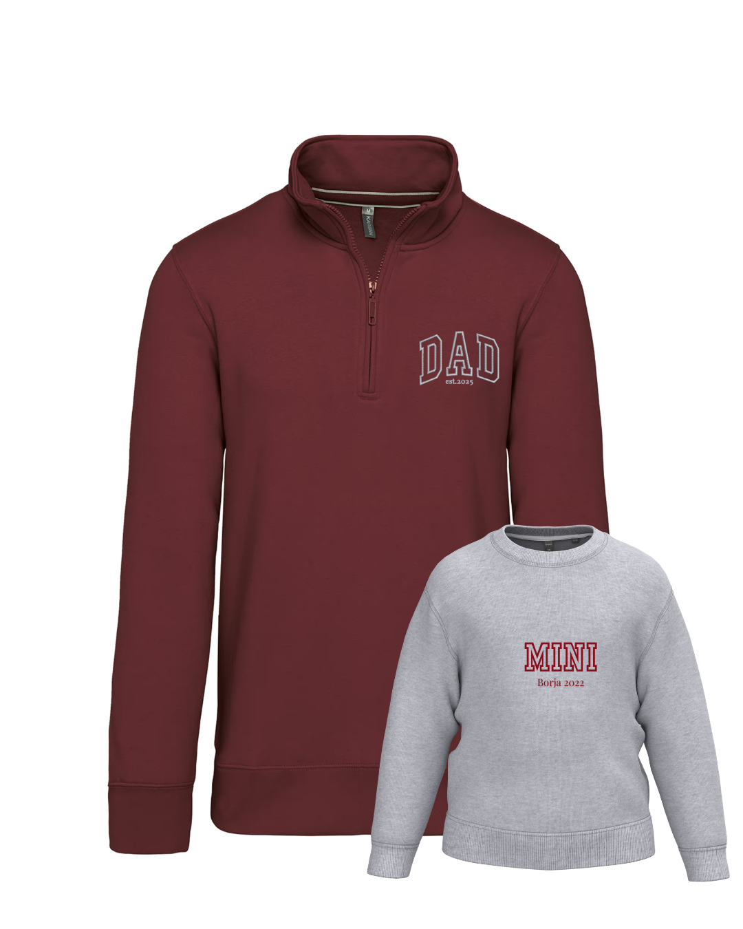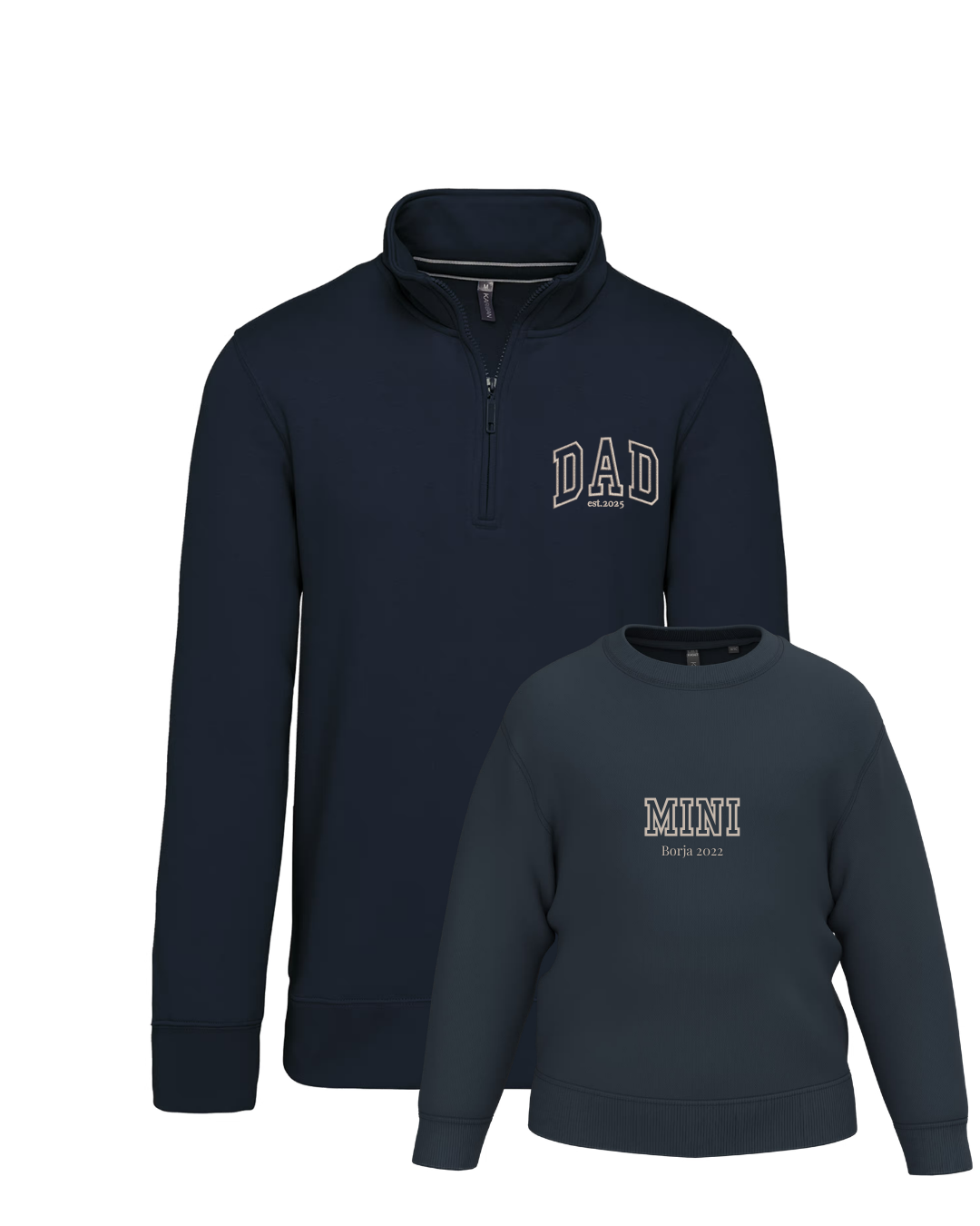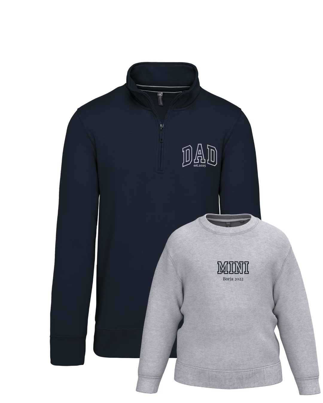 - Personalíza cada una de las sudaderas con el bordado de la imagen a tu gusto. Las palabras DAD y MINI aparecen siempre. Añade tantos nombres o fechas debajo. Se colocarán uno debajo del otro.
