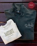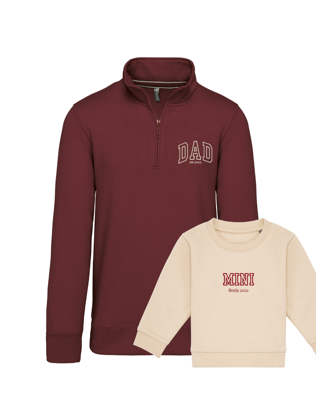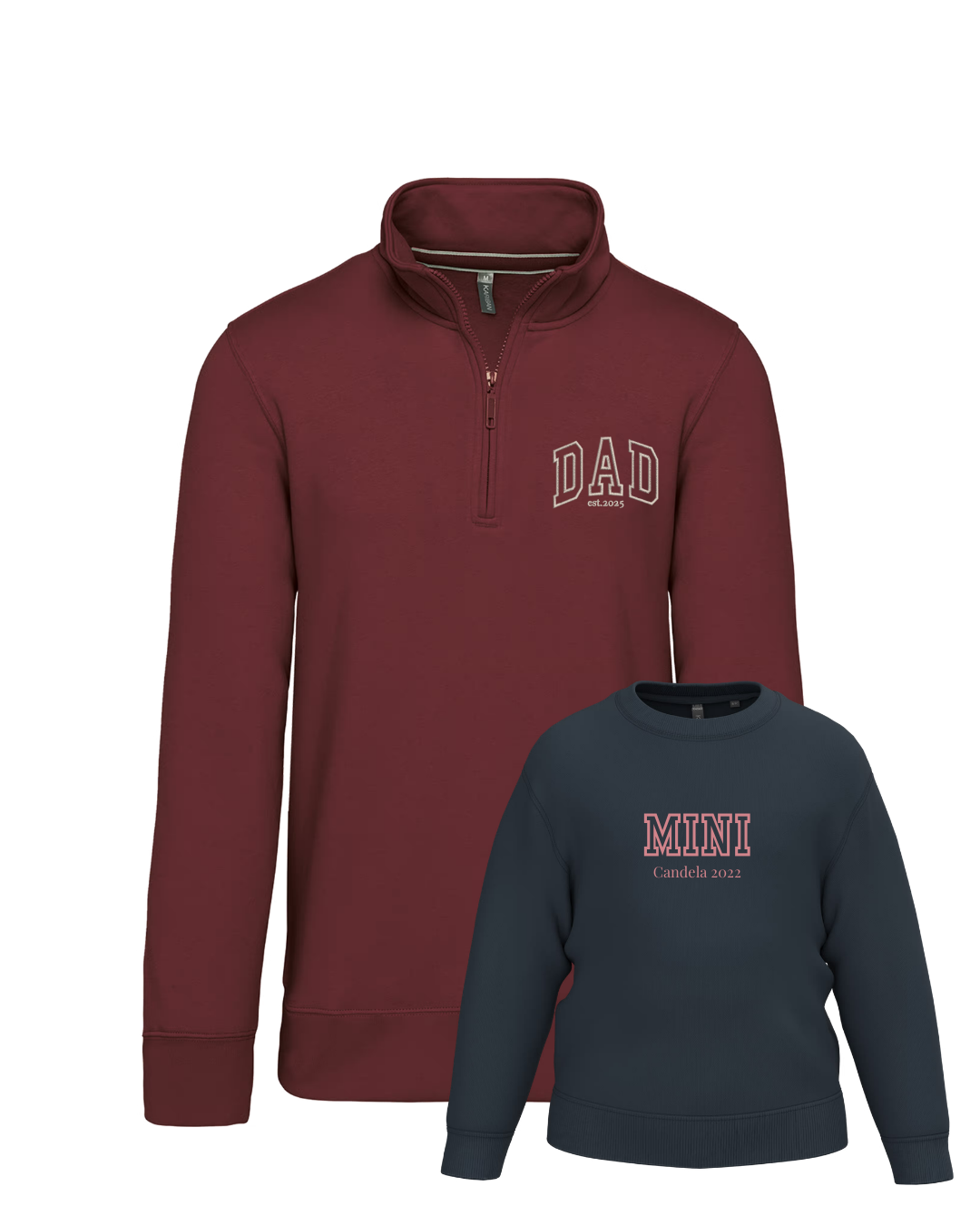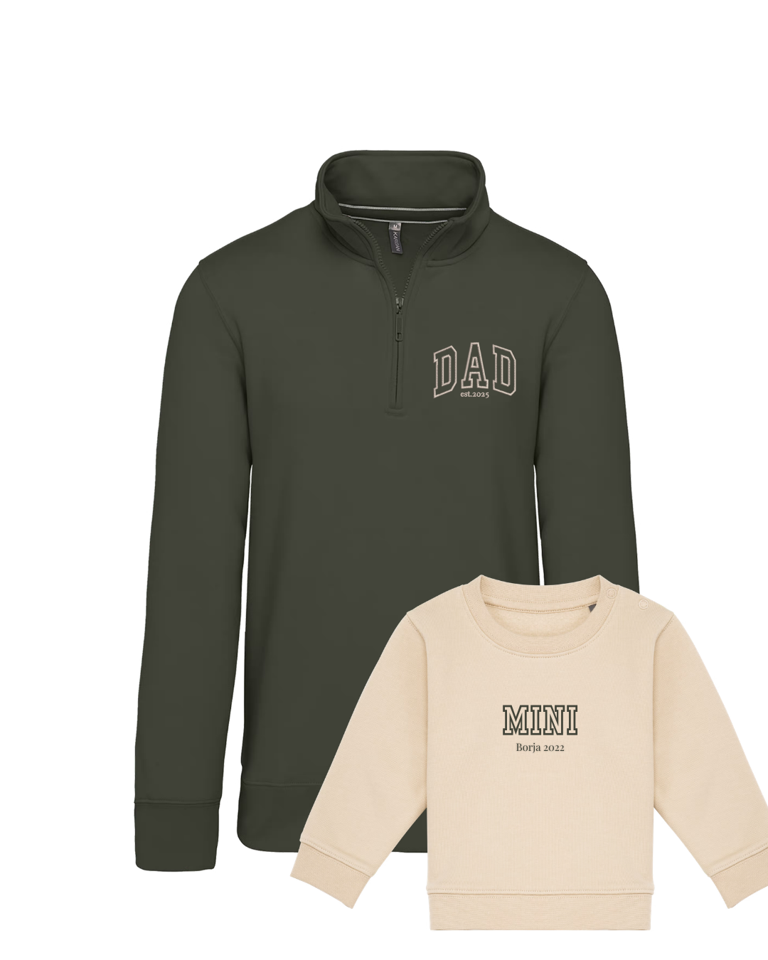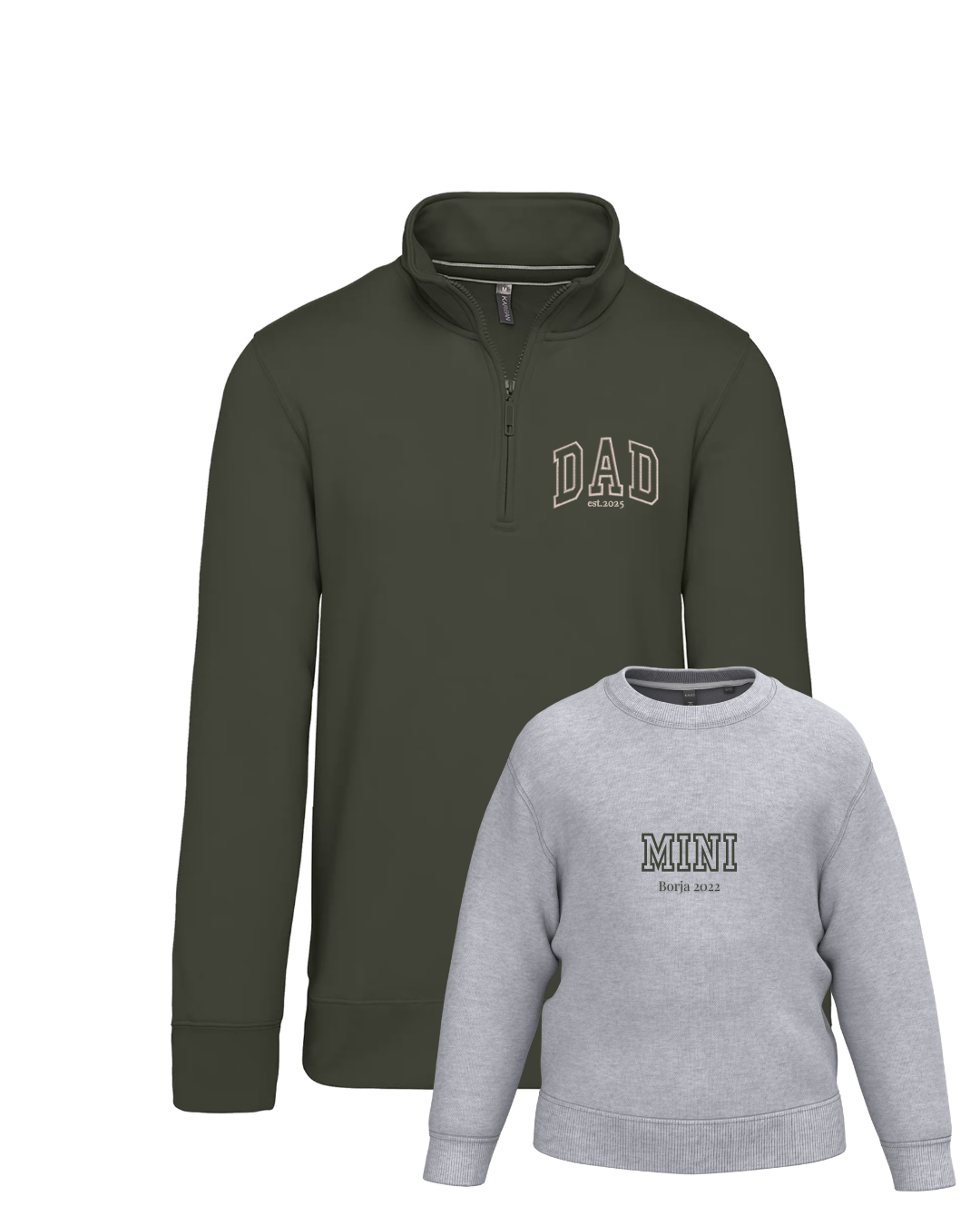 - Personalíza cada una de las sudaderas con el bordado de la imagen a tu gusto. Las palabras DAD y MINI aparecen siempre. Añade tantos nombres o fechas debajo. Se colocarán uno debajo del otro.
