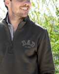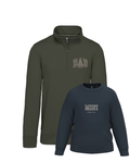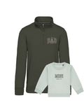 - Sudadera zip unisex personalizada con la palabra DAD, una frase debajo y en la parte trasera un bordado personalizado. La sudadera de niño personalizada con la palabra MINI y una frase debajo.