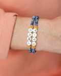 Pulsera hecha a mano de piedra mineral sodalita y entrepiezas doradas. En el centro abalorios blancos con letras doradas. Hecha con goma elástica y adaptable a cualquier muñeca.