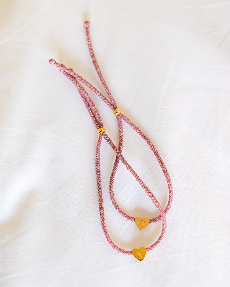 Hilo elástico brillante grueso con un corazón con inicial, acabada con bolitas en las puntas.