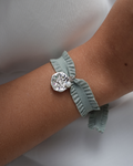 Pulsera stretch de cinta elástica con volante alrededor. Lleva la plaquita de martelé mamá con una perla pequeña.
