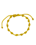 Pulsera de hilo en diferentes colores con charm plaquita con dos corazones enlazados grabados y circonita verde.