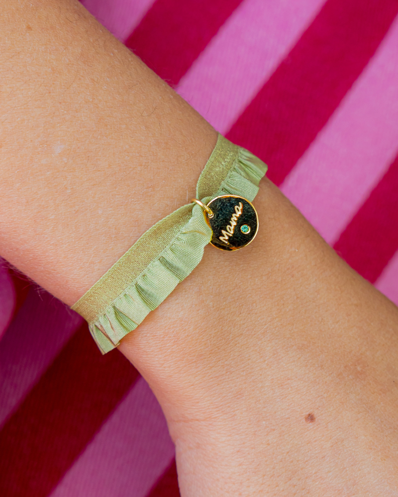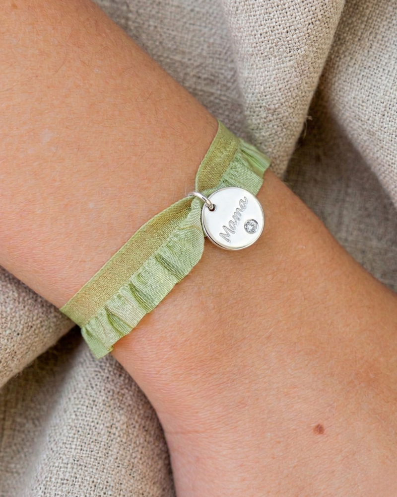 ¿Buscas un regalo único, cómodo y especial? Nuestra pulsera rizo es perfecta para sorprenderla. Su original cinta elástica fruncida se adapta perfectamente a la muñeca, acompañada de una plaquita grabada con la palabra "mamá" y una circonita de color. ¡Ideal para llevar a diario!