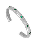 Brazalete rígido con textura rugosa con circonitas verdes intercaladas. Ajustable.