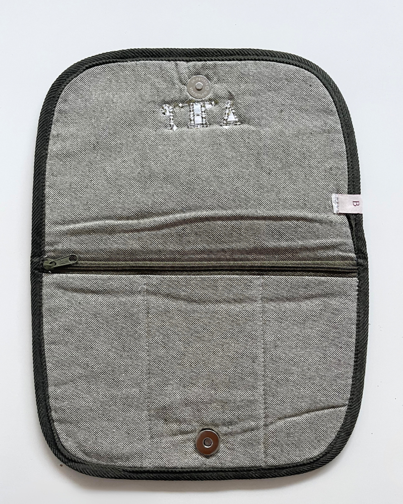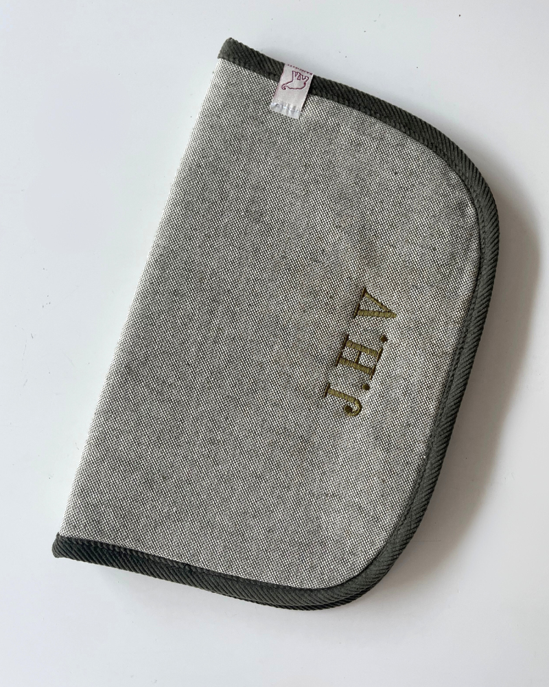 Relojero de viaje de tejido de algodón en beige y verde con parte interior a juego. Tiene cierre mediante imán y un bolsillo interior con tres compartimentos para llevar 3 relojes.