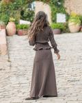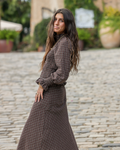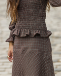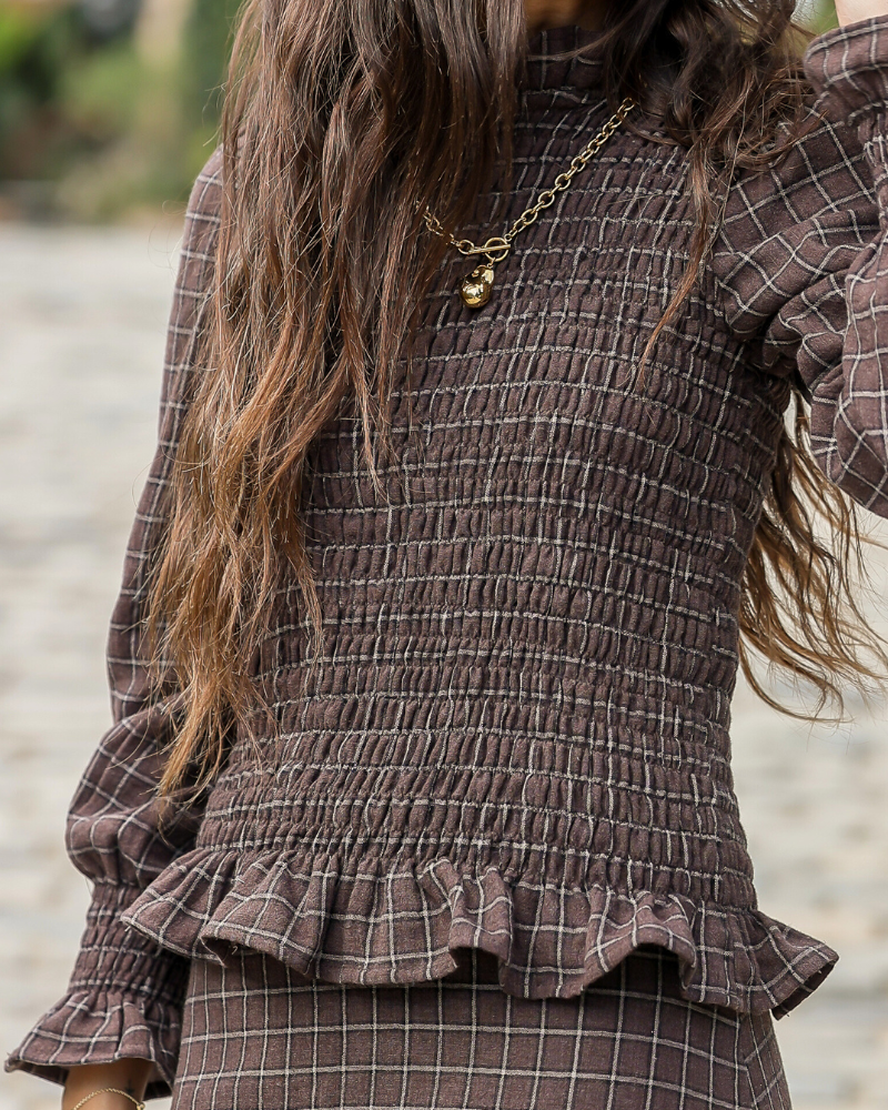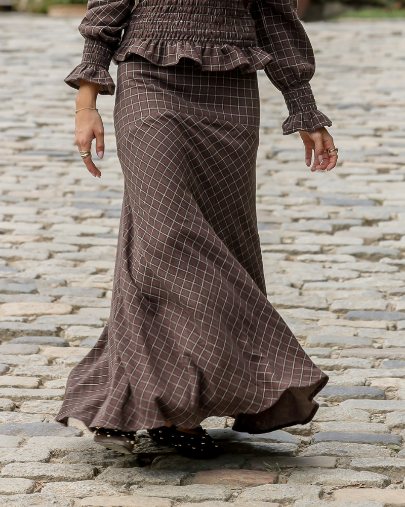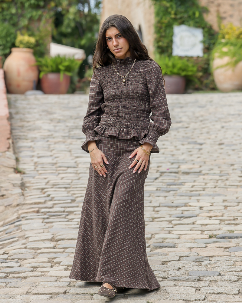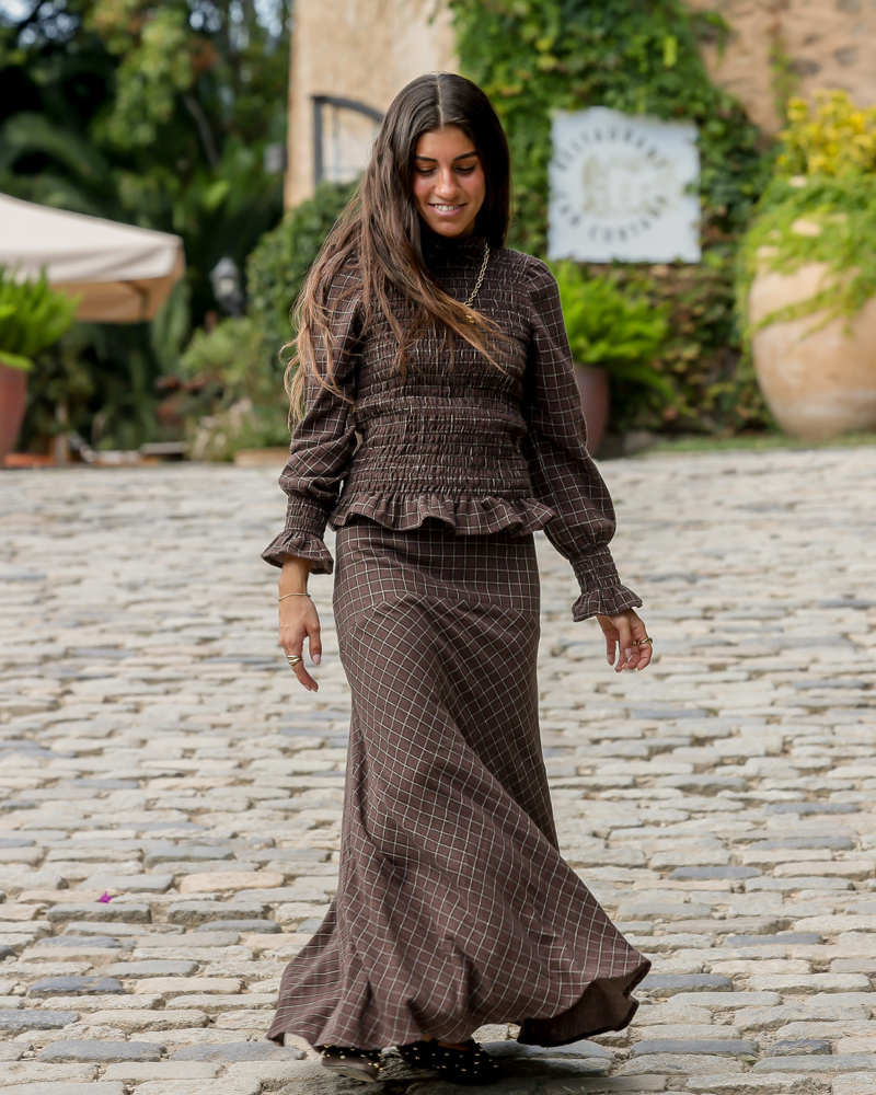El conjunto está fabricado en un tejido de algodón marrón con cuadros beige. La parte inferior es una falda larga con mucho vuelo que presenta un canesú asimétrico en la cadera, que aporta estructura y realce a la silueta, garantizando un ajuste favorecedor. Cierre con cremallera en el lateral. Y, en la parte superior lleva una camisa fruncida acabada en un volante. Cuello con mini volante que se ata con un botón y mangas ligeramente abullonadas que terminan en puño con frunce idea.