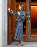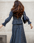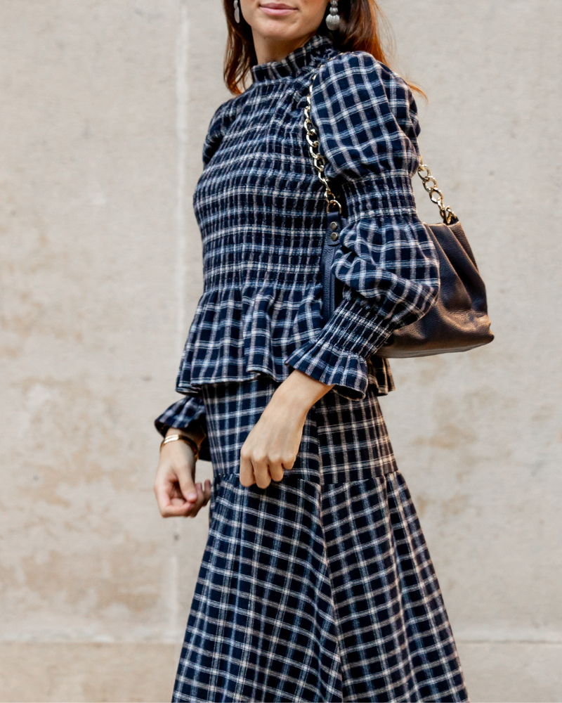 Conjunto de blusa y falda en tejido de lana de cuadros en tonos azul. La parte superior es una camisa con cuello alto redondo con volante y frunce en nido de abeja en la parte del pecho. Cierre en la parte trasera con 1 botón y una lágrima. Mangas un poquito abullonadas con gomitas en la parte superior del brazo y en el puño. Acabado en volante. La parte inferior es una falda larga con mucho vuelo. Presenta un canesú asimétrico en la cadera, que aporta estructura y realce a la silueta, garantizando un ajuste favorecedor. Lleva goma en la parte trasera para un mejor ajuste.