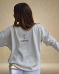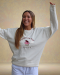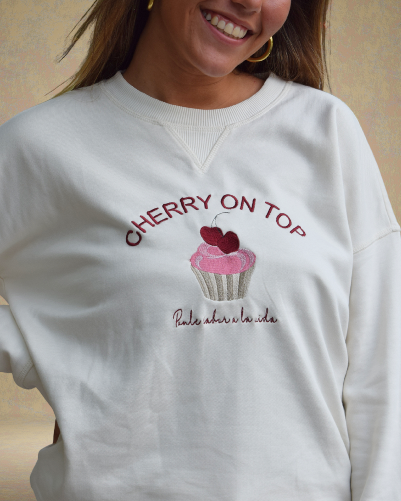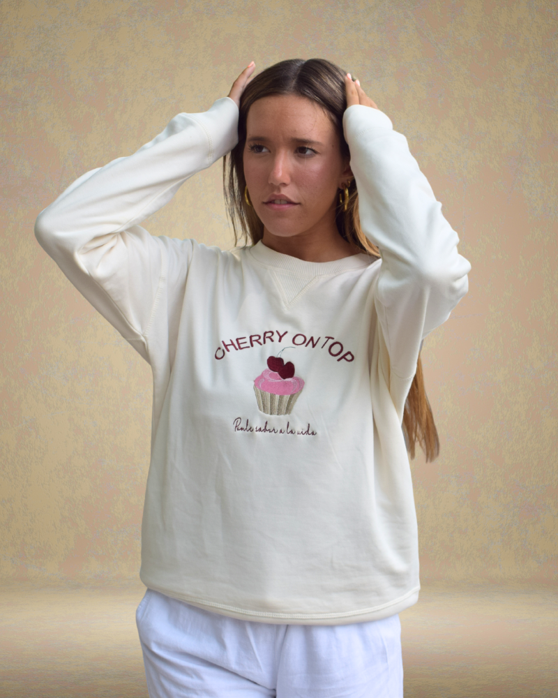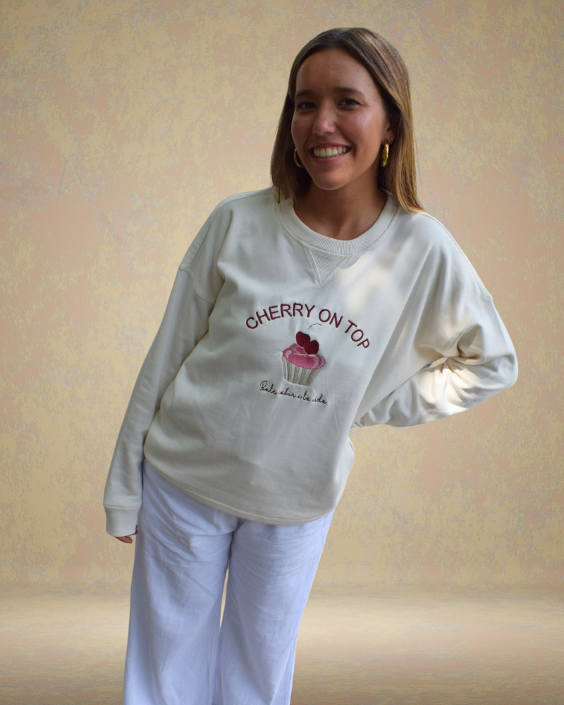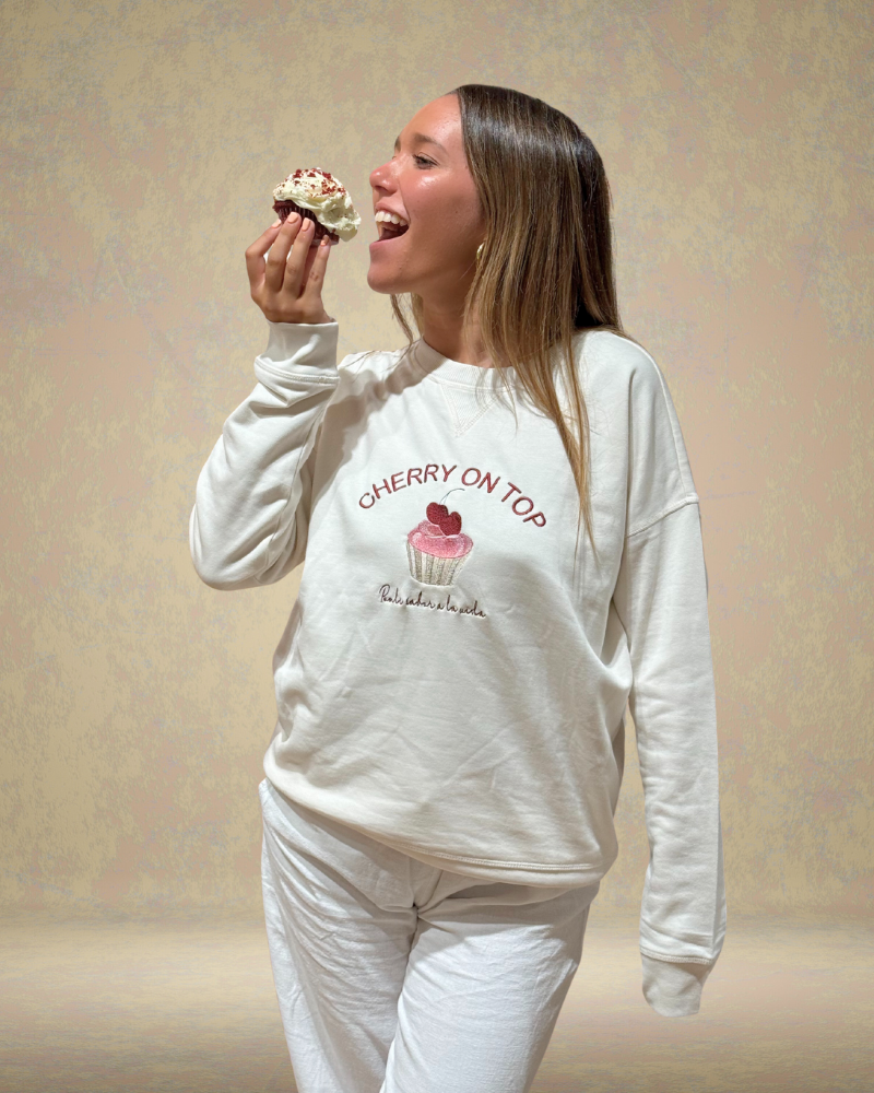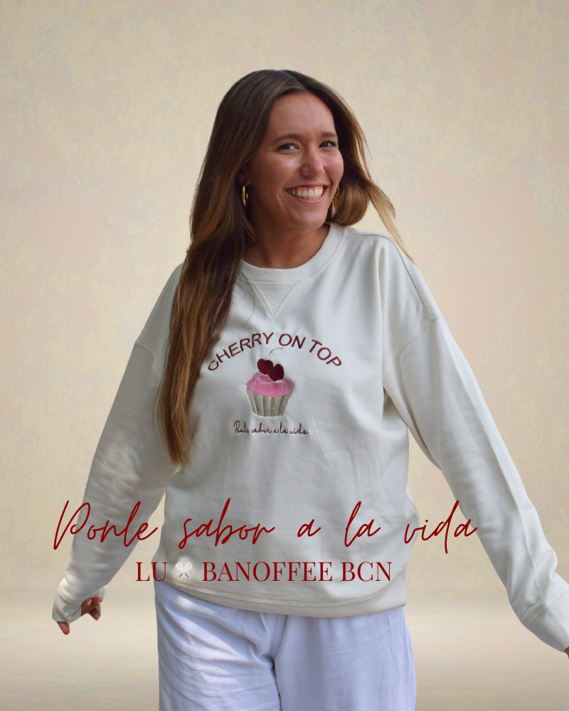 Sudadera en tono beige, con bordados delanteros y traseros. En el pecho, la frase Cherry on top acompaña a un cupcake con cerezas y el mensaje Ponle sabor a la vida. En la espalda, está bordado LU x BANOFFEE BCN (la x son dos varillas cruzadas).