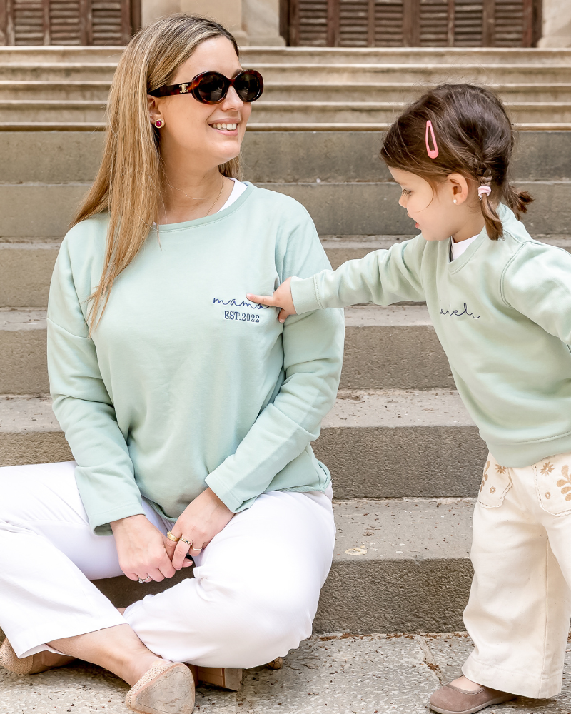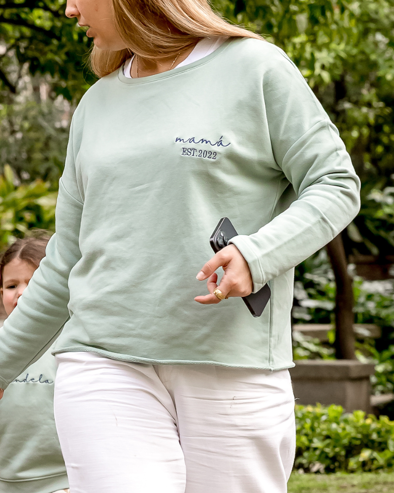 Sudadera personalizada de olor verde mint con texto mamá y la frase de abajo personalizable.