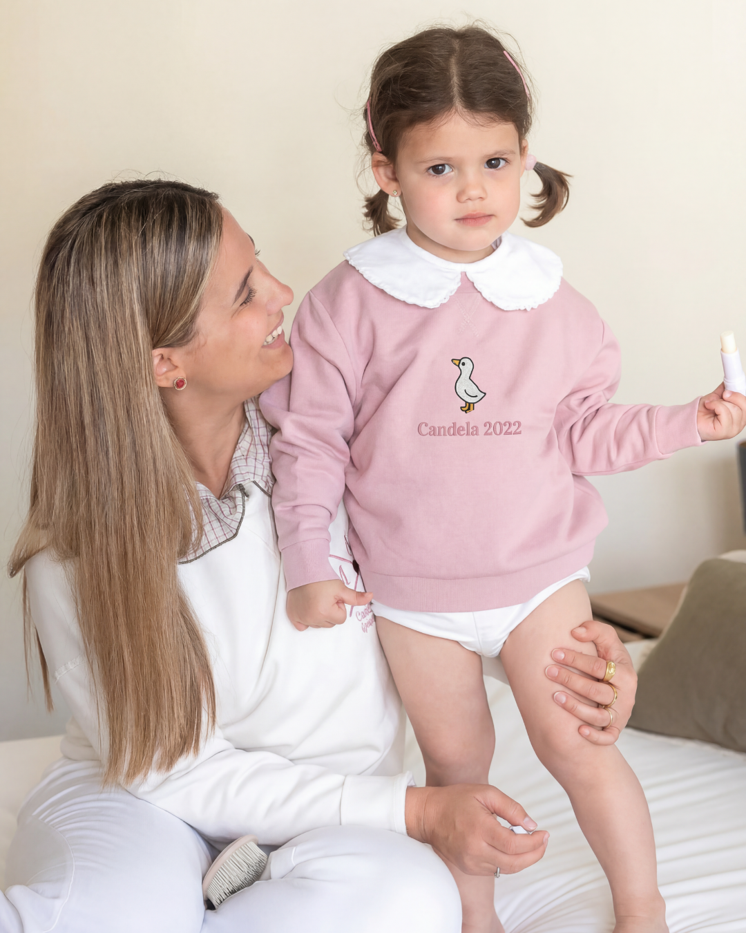 Esta sudadera se personaliza con un pato y una frase en el medio, creando una prenda única, hecha especialmente para los más peques.