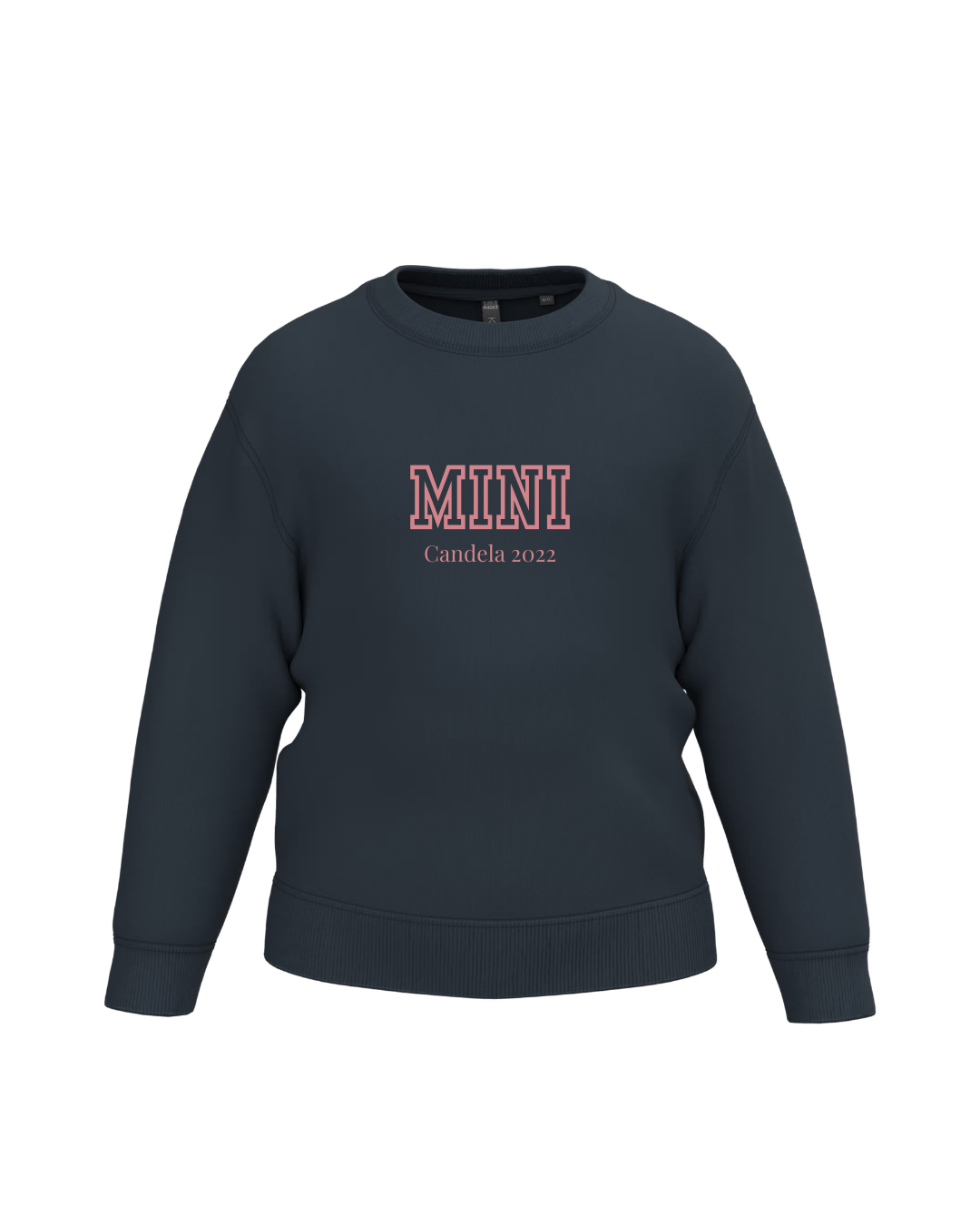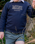 - Sudadera de niño personalizada azul marino con bordado de la palabra MINI y una frase.