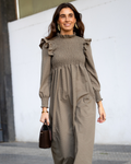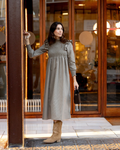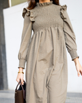 Vestido tobillero de tejido de algodón orgánico de vichy mini turquesa y camel. Cuello alto con volante que ata por detrás con un botón y parte del pecho fruncida en nido de abeja con volantito en la parte de la sisa. Manga larga un poco abullonada en la parte del hombro que termina en puño con gomitas y volante.