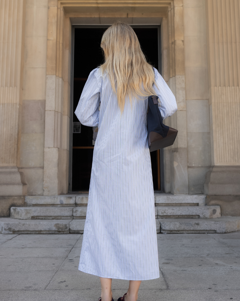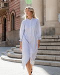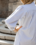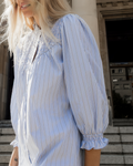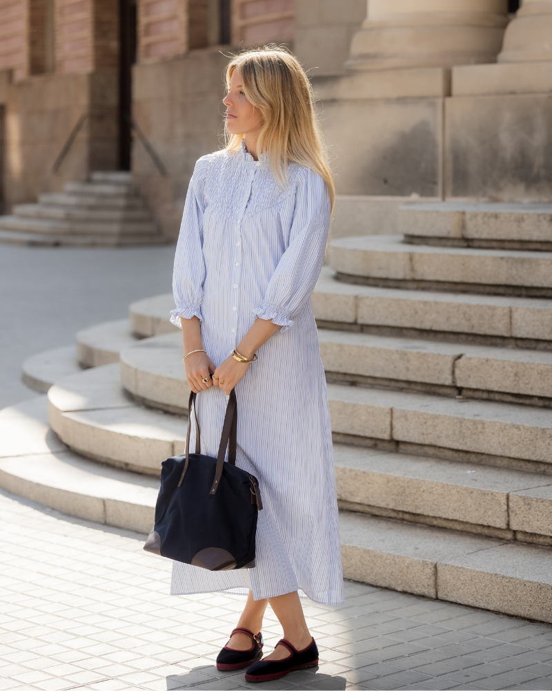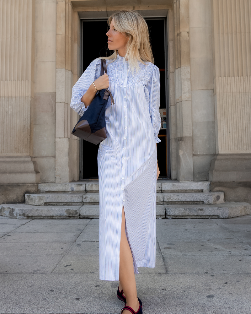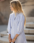 Vestido midi confeccionado en un tejido ligero de rayas azul cielo, blanco, verde y amarillo. Cuenta con volante en el cuello y detalles de nido de abeja en el pecho. Su manga larga ligeramente abullonada termina en un puño con volante. Abotonado de arriba abajo con apertura final.